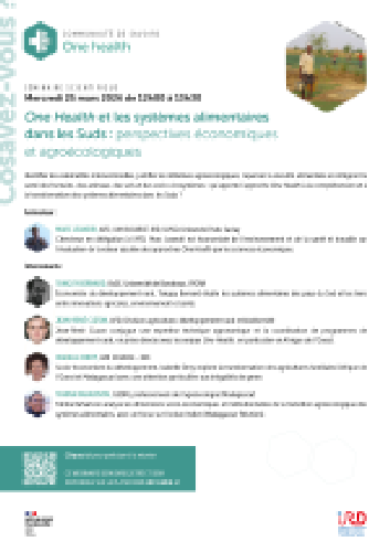 | One Health et les systèmes alimentaires dans les Suds : perspectives économiques et agroécologiques 25 mars 2026 Le 25 mars 2026, la Communauté de Savoirs One Health de l’IRD (COSAV One Health) organise un séminaire scientifique intitulé « One Health et les systèmes alimentaires dans les Suds : perspectives économiques et agroécologiques ». | |
